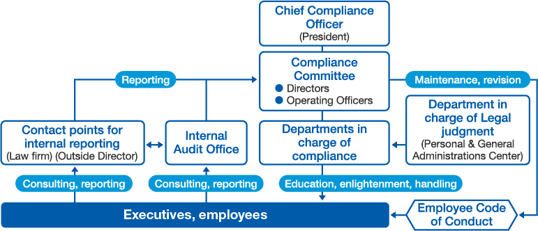 Based on the “Compliance Regulations”, which specify the basic structure, roles of relevant parties, action guidelines and other matters concerning compliance, we set up the Compliance Committee chaired by the President. Thus, we are pushing ahead with the development of the structure to ensure compliance for the entire Group and use various opportunities to raise awareness of every executive and employee.