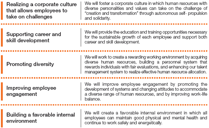 As part of our efforts to develop human resources and improve the internal environment with the aim of creating human value from a short-, medium-, and long-term perspective, we have established the Human Resource and Internal Environment Development Policy as shown below.