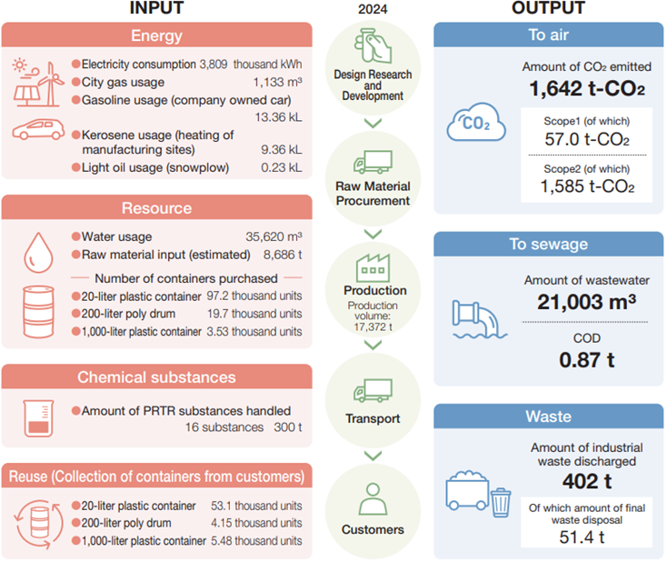 In order to make effective use of limited resources without waste, we collect used polyethylene containers of our products from our customers. We sort the containers to determine if they can be reused, and those that can be reused are cleaned and reused by the Company and contractors.