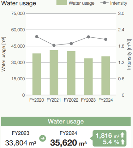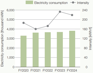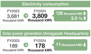 Electricity consumption in FY2024 increased from FY2023. Since the manufacturing volume increased more than the electricity consumption did, the intensity has decreased. Electricity use is expected to continue to increase as it is mainly used to improve the working environment. In order to reduce our environmental impact as much as possible, we are generating electricity with solar power on the roof of the Amagasaki Headquarters.