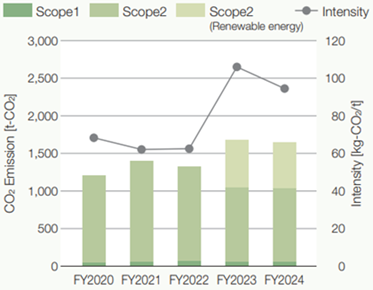 We have calculated the GHG protocol Scope 1 (fuel) and Scope 2 (electricity and heat) as CO2 emissions. Scope 2 (electrical) accounts for 97%. CO2 emissions in FY2024 were almost the same as in FY2023, but the intensity decreased because the manufacturing volume increased significantly. For Scope 3, we calculated for all categories in FY2024.