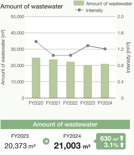 Because water is a key ingredient in MEC’s products, the amount of water used changes according to changes in the volume of products manufactured. We understand the amount of water used and are aware that we use a large amount not only in our raw materials but also in our manufacturing facilities, container cleaning, and substrate processing lines in our R&D activities. For this reason, we are working to reduce the number of times equipment is cleaned, to introduce automatic container-cleaning equipment, and to reduce wasteful use in substrate processing line work. Water used in manufacturing and R&D operations is treated in wastewater treatment facilities in line with the regulated standards and discharged into the sewerage system as wastewater. We manage wastewater to ensure that we do not discharge wastewater that exceeds standards. In FY2024, there were no wastewater discharges that exceeded standards. We will continue to make efforts for appropriate management.