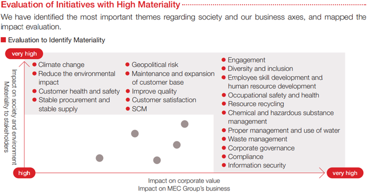 | Risk management | Visualize management risks and implement countermeasures | Review management risks as appropriate and implement countermeasures Visualized various risks and countermeasures that impede the MEC Group’s sustainable growth and reported and discussed them at the Risk Management Committee. |