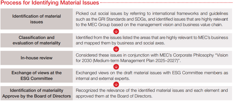 MEC sets out its goal under the “Vision for 2030” to open up the future through collaboration and co-creation with stakeholders, create a virtuous cycle of social value and economic value, and contribute to the creation of an affluent society. In Phase 2 of the “Medium-term Management Plan 2025-2027”, we continue to promote this policy. To achieve this virtuous cycle, we have identified materiality issues (materiality) and are promoting initiatives in terms of both our product and service offerings and business processes.