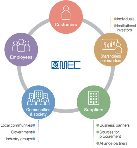 MEC values dialogue with its stakeholders, including customers, employees, shareholders, investors, business partners, and the members of local communities, and aims to co-create value with them by sincerely accepting the valuable comments received through communicating with all parties and reflecting such comments in management and business activities. By building relationships of trust through dialogue and creating new value together with all our stakeholders, we will put our corporate motto into practice and contribute to the achievement of a sustainable society.